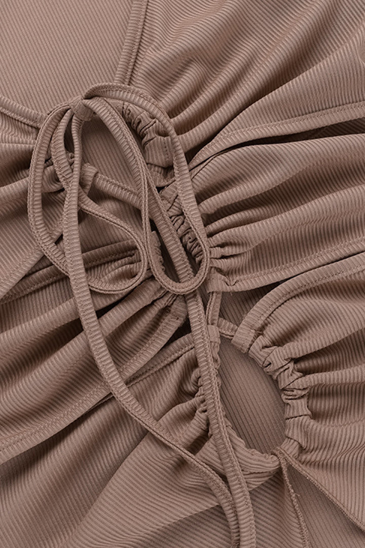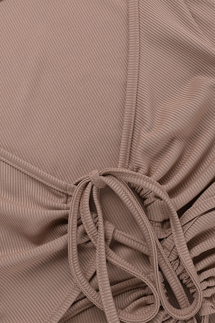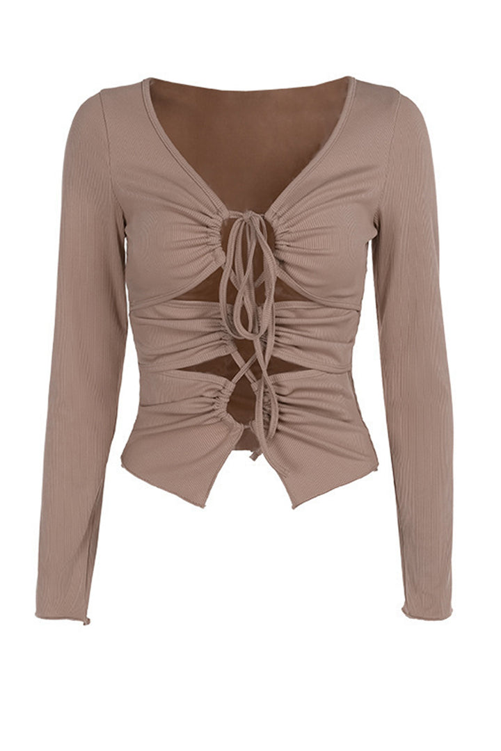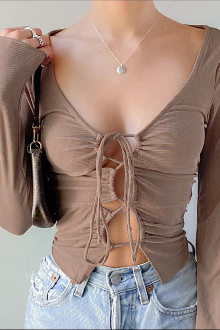 - Crafted for the bold and the beautiful, this top is a symphony of sensuality and style. The deep V neckline immediately draws eyes, while the intricate lace up detail in the front adds a touch of alluring mystery. It hugs your curves in all the right places, accentuating your figure with a flattering silhouette.