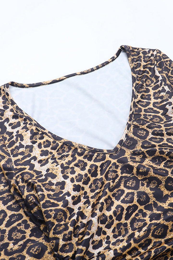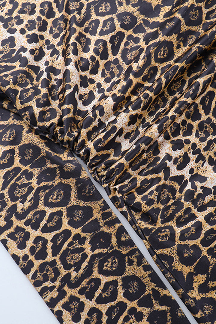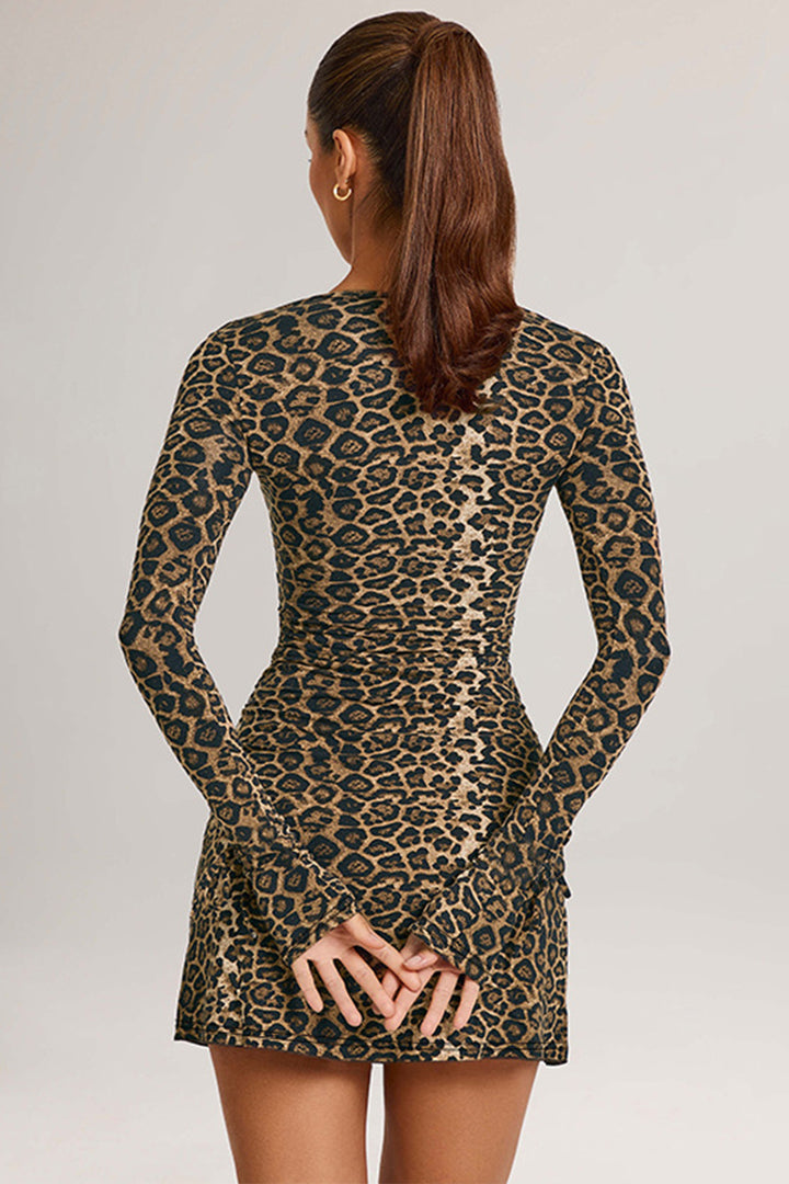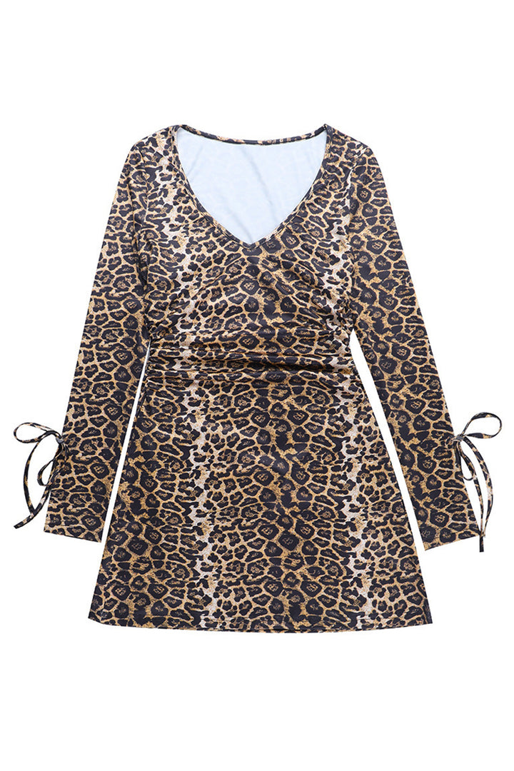 - This isn't just a dress; it's a statement piece that screams confidence and style. The all over leopard print is bold yet timeless, making you the center of attention wherever you go. The deep V neckline adds a touch of allure, while the long sleeves offer a bit of coverage and elegance.